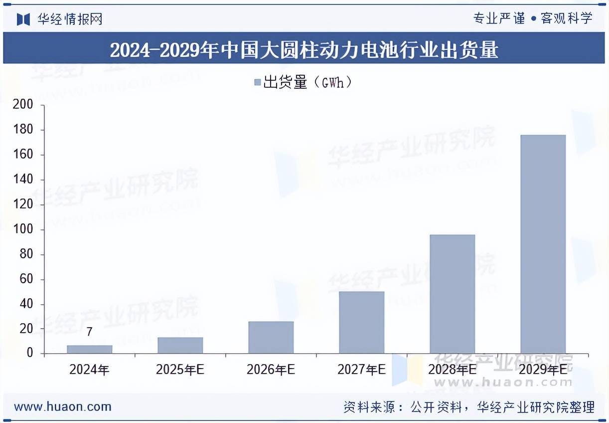 当下,国内新能源汽车市场产销两旺,储能产业也蓬勃发展,为大圆柱动力电池市场注入强大活力。2024年中国大圆柱动力电池出货量已达7.0GWh。众多企业积极布局产线,研发投入持续加大,推动技术与工艺革新。在此良好态势下,预计到2029年,中国大圆柱动力电池出货量将大幅跃升至176.8GWh,年复合增长率达91.0%,前景十分广阔。
