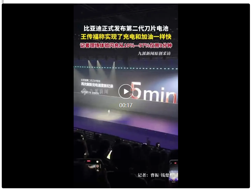 另据九派新闻,3月5日,比亚迪召开主题为"闪充中国 改变世界"的颠覆性技术发布会。会上王传福称第二代刀片电池的极致充电速度,从10%充到70%,只用5分钟就能充好。从10%充到97%,只用9分钟就能充饱,真正实现了“充电”和“加油”一样快。